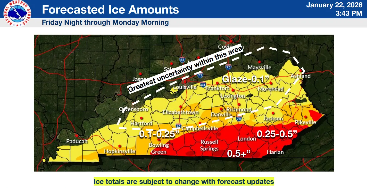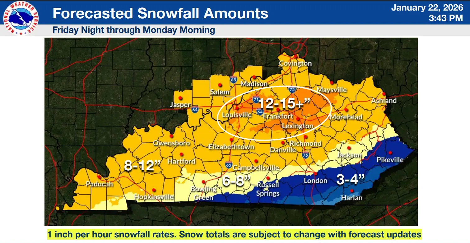A developing storm system has the potential to bring heavy snow and a mix of sleet and freezing rain to the area this weekend, making travel difficult to near impossible. Snow accumulations range from 8 to 12 inches with locally heavier amounts possible. The as of 3 PM CST 1/22/26…